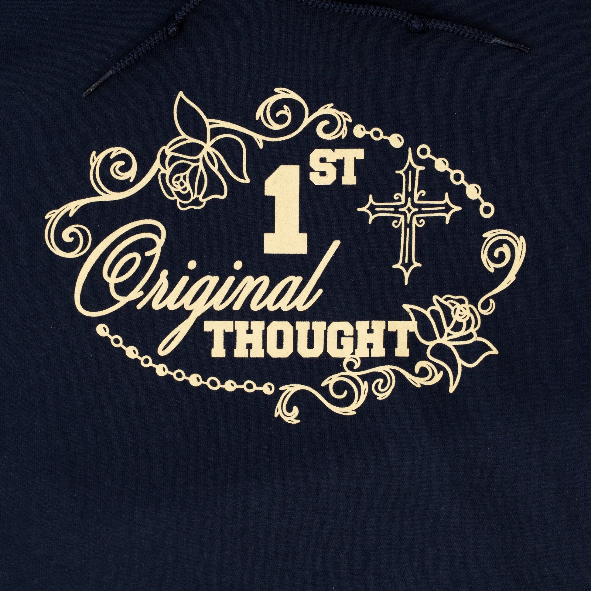 Navy hoodie with screen printed front, back and sleeve hits